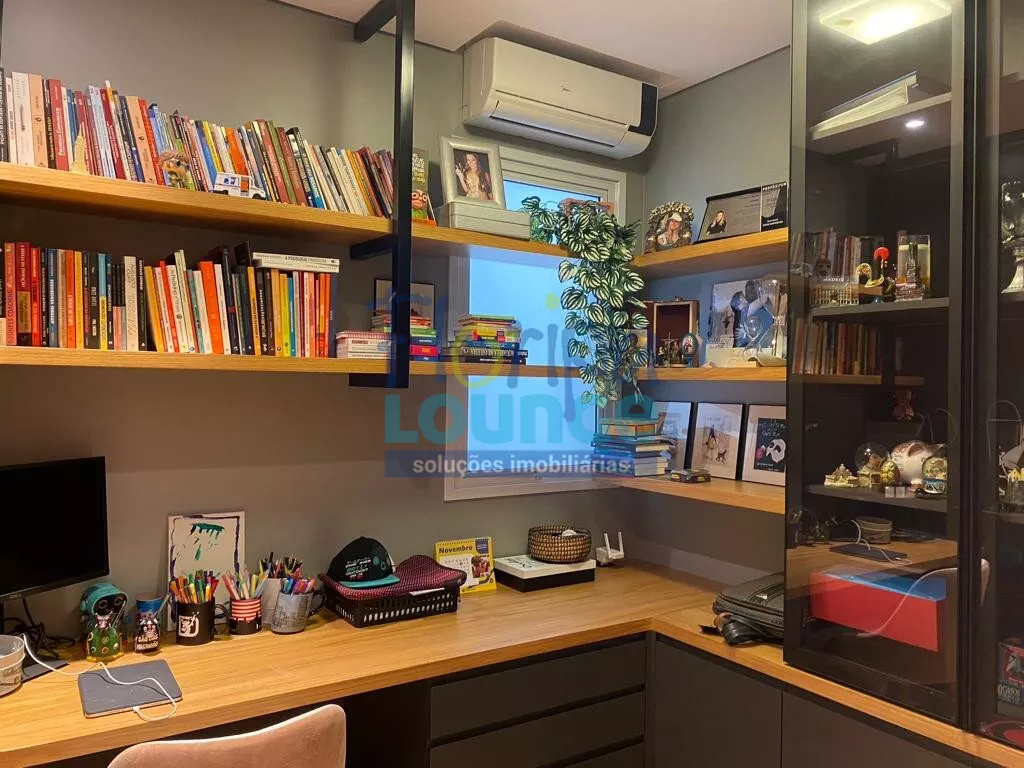 O apartamento também possui um lavabo elegante, uma área de serviço bem equipada e um banheiro de serviço. Um escritório bem iluminado e projetado com atenção aos detalhes oferece um espaço perfeito para o trabalho ou estudos em casa.